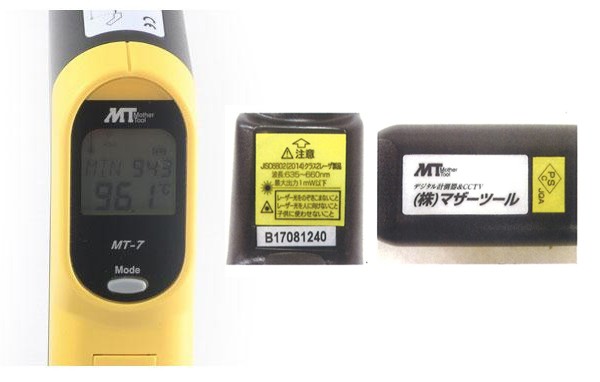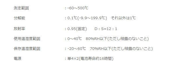 | 仕様 | 消費生活用製品安全法適応商品 レーザーポインタ付 最大/最小/平均/DIFホールド機能 表示分解能0.1度 精度:±2%または±2度どちらか大きい方 クラス2レーザー製品 波長:635~660nm 最大出力1mW以下 |