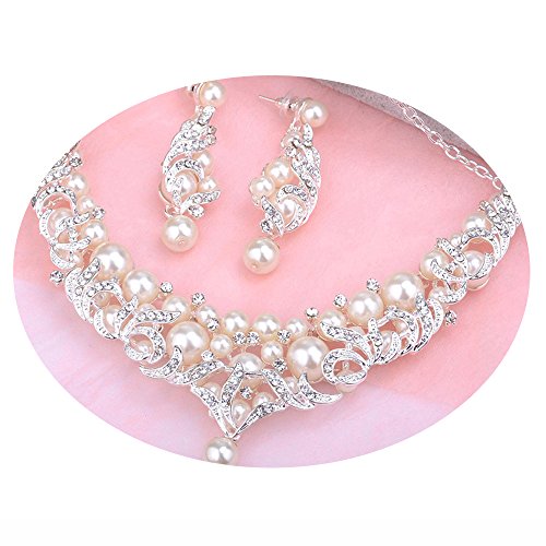 Simulated Pearl Silver Crystal Rhinestone Teardrop Pendant Necklace Dangle Earrings Wedding Jewelry Sets for Brides Clear