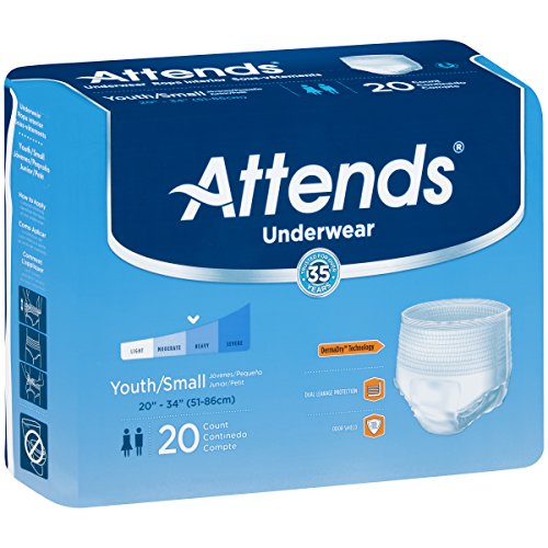Attends Advanced Protective Underwear with Advanced DermaDry Technology for Adult Incontinence Care, Youth/Small, Unisex , 20 Count (Pack of 4)