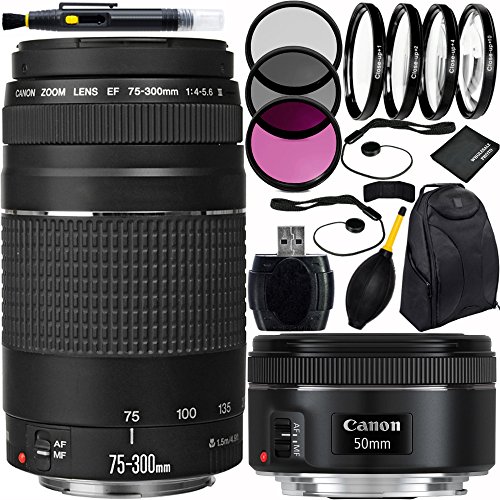 Canon EF 75-300mm f/4-5.6 III & EF 50mm f/1.8 STM Dual Lens Bundle with Accessory Kit for EOS 7D Mark II, 7D, 80D, 70D, 60D, 50D, 40D, 30D, 20D, Rebel T6s, T6i, T5i, T4i, SL1, T3i, T6, T5, T5, T3, T2i