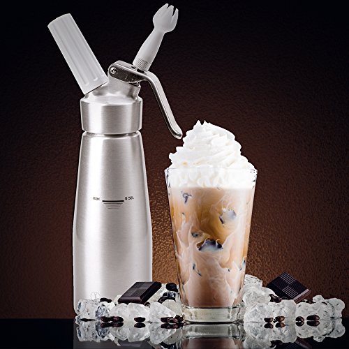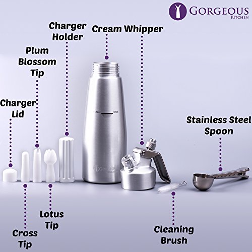 Professional Whipped Cream Dispenser - Premium Cream Whipper, Durable Stainless Steel Coffee Spoon, 3 Decorating Nozzles, Charger Holder, Cleaning Brush and Instruction Manual Included - 1 Pint