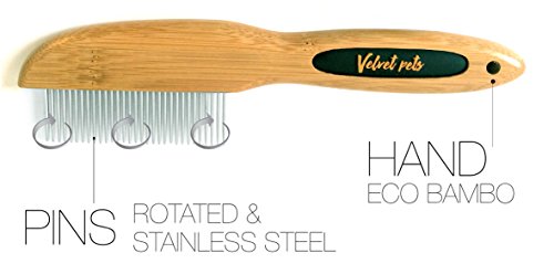 - ROTATED PINS in the comb are much more comfortable for pets - Ergonomically designed bambo handle fits your hand for a solid grip - Lightweight bamboo material is much more durable that wood or plastic.