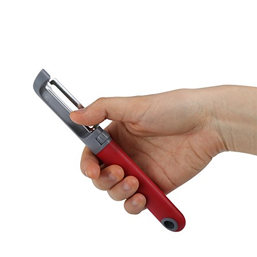 Dual Stainless Steel blades stay ultra sharp and swivel for smooth, effortless peeling.Swiveling twin blades with flexible action easily peel potatoes, apples and other tough-skinned fruits and vegetables,Soft, oversized handle designed for repetitive strokes