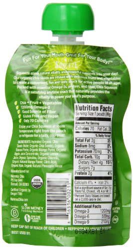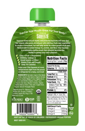 The Mamma Chia Organic Chia Squeeze Vitality Snack is a blend of fruits, vegetables and Chia, the world’s most nutrient dense food, to create a deliciously satisfying anytime snack for active people of all ages. Chia Squeeze Vitality Snacks have only 70-calories and are a healthy way to provide your body with the essential nutrition it needs. Each 3.5-ounce serving contains 1200-milligrams of Omega-3 and is a source of protein, fiber and revitalizing antioxidants. A delightful combination of organic Bananas and Mangoes along with the goodness of Kale, Spirulina and Chlorella makes Green Magic revitalize you with every sip. The pouches fit easily in purses, lunch boxes or gym bags and do not require refrigeration, so they are the perfect anytime snack for active souls of all ages. As with all Mamma Chia products, Chia Squeeze is certified USDA Organic, non-GMO verified, no added sugar, gluten free and vegan. The Mamma Chia Organic Chia Squeeze Vitality Snack comes in a 4-pack of 3.5-ounce pouches. As the category innovator who created the first-to-market chia seed beverage, Mamma Chia is committed to sharing the Magic of Chia® by offering the highest quality organic chia-based products that provide vitality, energy and strength. We are a conscious and sustainable company that is dedicated to giving back and uplifting both the soul of humanity and the soul of the planet. Visit http://www.amazon.com/MammaChia for more information on Mamma Chia and our extensive line of products.Feature
