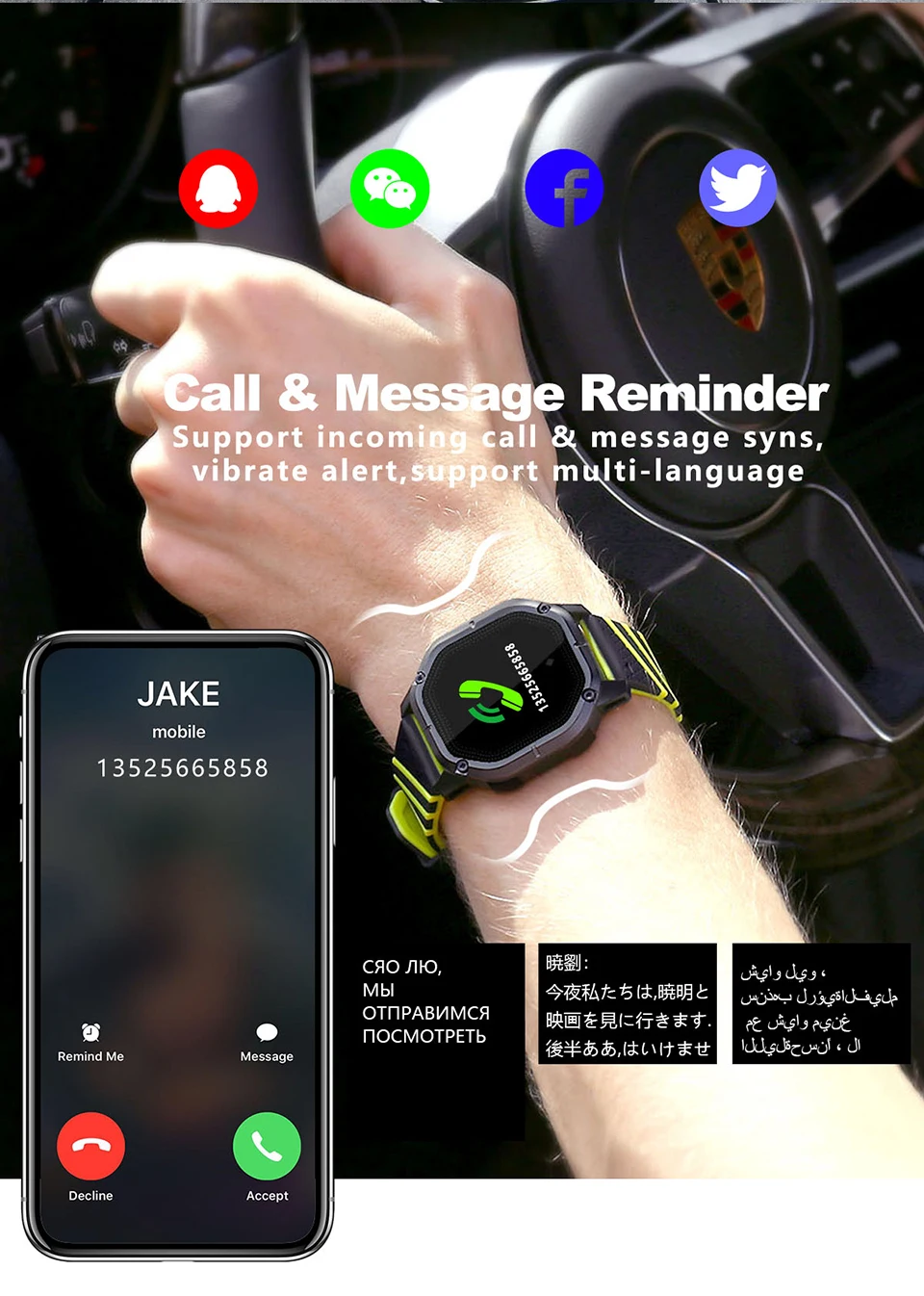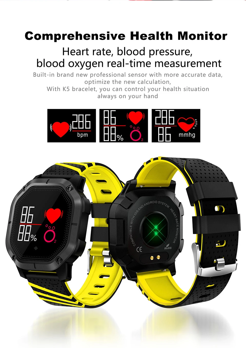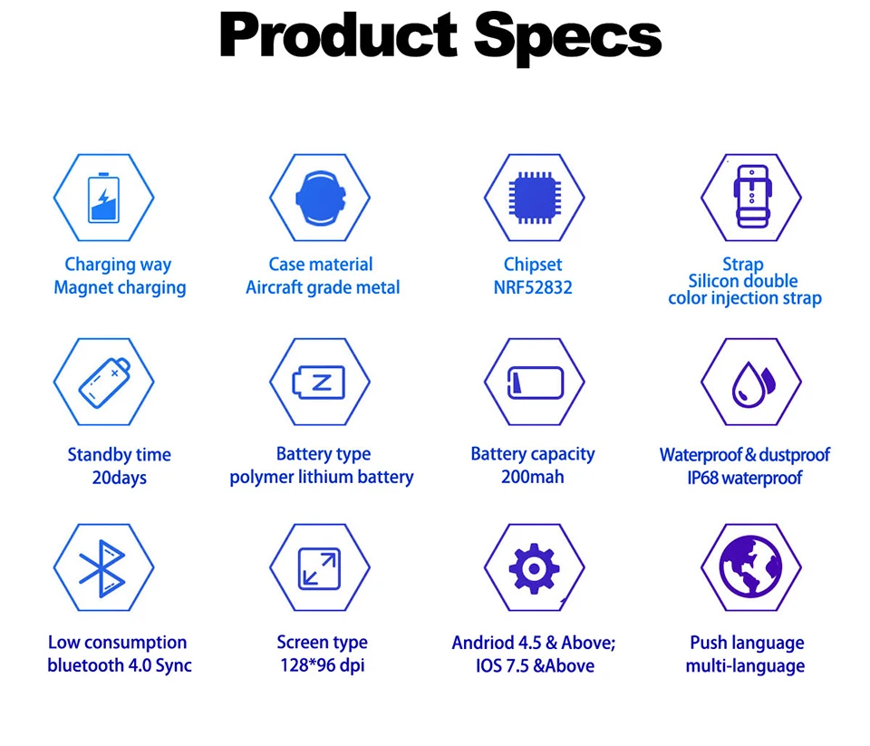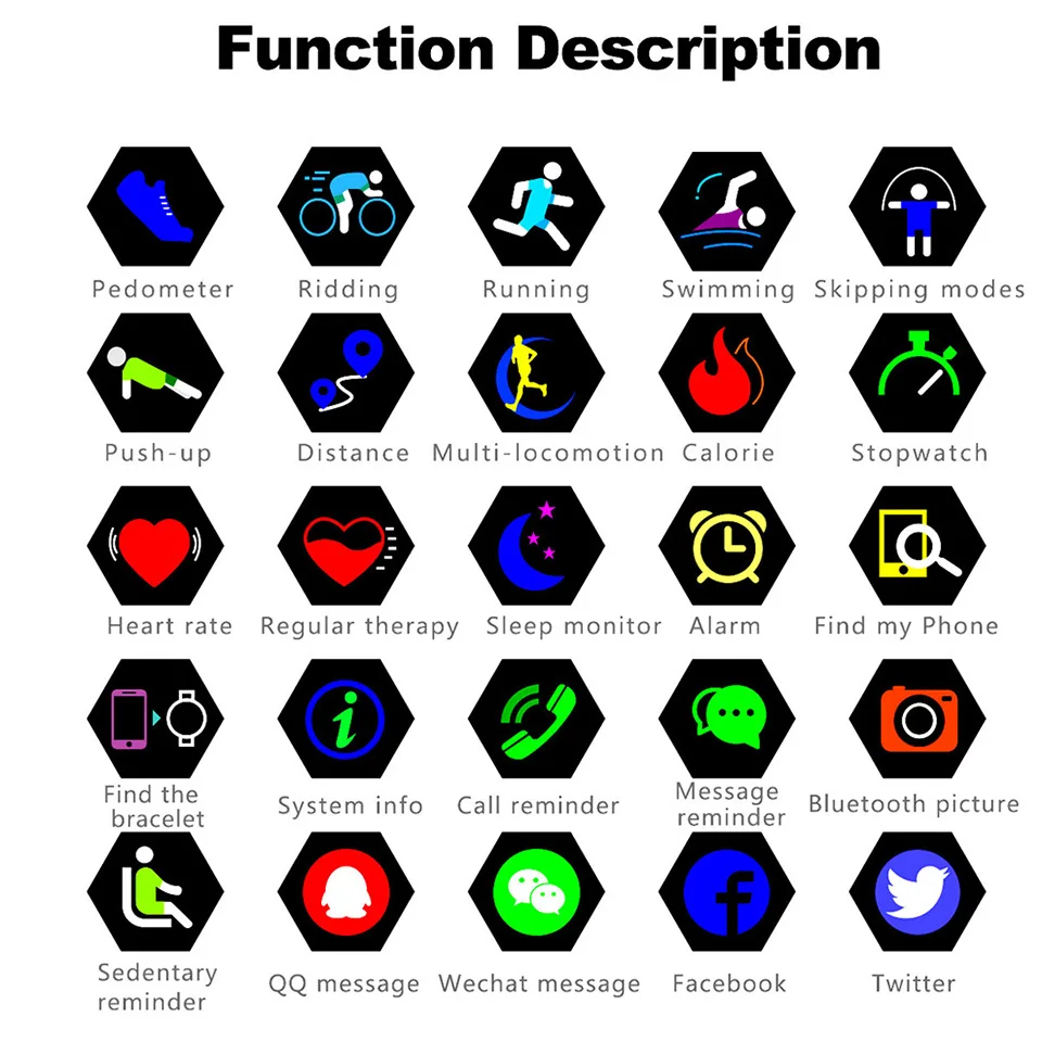 Function:Passometer,Fitness Tracker,Sleep Tracker,Message Reminder,Call Reminder,Remote Control,Push Message,Heart Rate Tracker