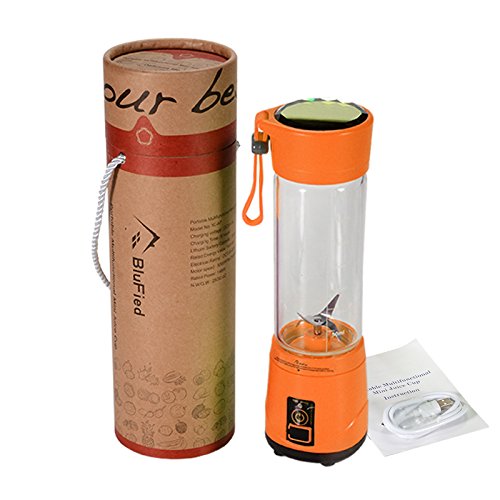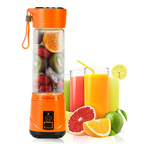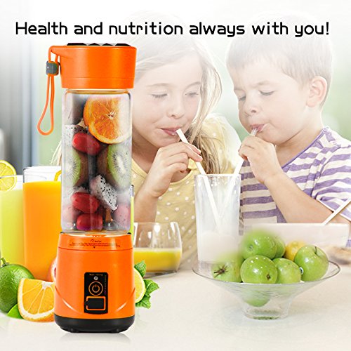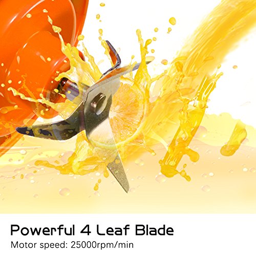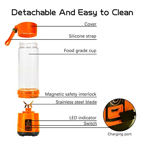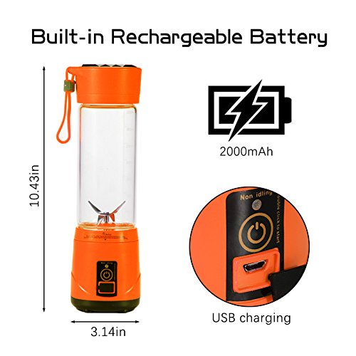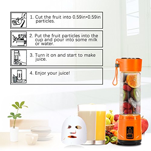 Extreme Powerful 4 pcs blades strong motor system make you can have; delicate juice, baby supplementary food, milk shake, amazing smoothie. Rechargeable Battery 2000mah battery, blend up to 20 times on a full charge, can be charged by usb cable, blender will not work at charging. Safety Protection Start to work after the cup is screwed on the base rightly and tightly. Easy To Carry Portable lightweight design perfect for outdoor, traveling and any places you want. Easy To Clean The bottom, boody and the cup can be taken apart for separate cleaning under the tap directly, but not plug the bottom into sink. Specifications: Material: Food-Grade PP/304 stainless steel/high borosilicate glass Volume: 420ml Motor rotation speed: 5000RPM to 25000RPM Motor model: DC 7.4V Charging voltage: DC5V 1A Charging time: 5 hours Battery capacity: 2000mAh Single work time: 40s Rated energy value: 14.8wh Power rate: 148W Product dimensions: 3.14 * 10.43in Net weight: 25.39oz Gross weight: 30.33oz Work time after full charged: 15 to 20 times Color: Green/Orange Package: 1 * Portable Juicer Cup 1 * USB Charging Cable 1 * User Manual How to use the juicer? 1. Prepare the fruit, cut them into 1.5cm. 2. According to your personal taste, add water or milk to 30%-60%, put the fruit in and make them lower than 80% of the bottle. 3. Press the button. It takes 1 min to 3 min for tasty juice base on the softness of fruit. Gently shake the bottle at 10 sec to make it more delicious. 4. Turn off the machine and enjoy the fresh and healthy drink. Please let us know if you have any problem,we will give you the best service and solve the problem ASAP.Thank you so much. 0 |