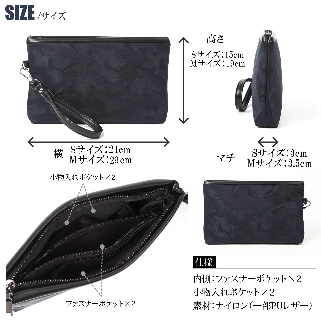 (Inside) Main storage × 2, open pocket × 2, ZIP pocket × 2