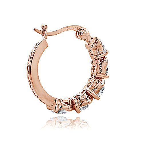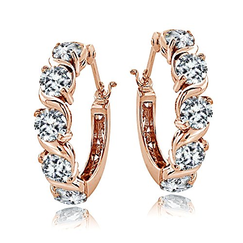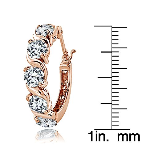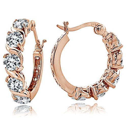 Add these hoop earrings to complement any fashionable attire. They features 4mm round cubic zirconia stones set in between an attractive S design. The earrings are crafted of rose Gold Flash sterling silver and secured by post with snap-down clasps.