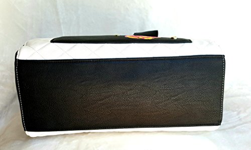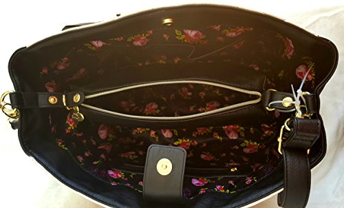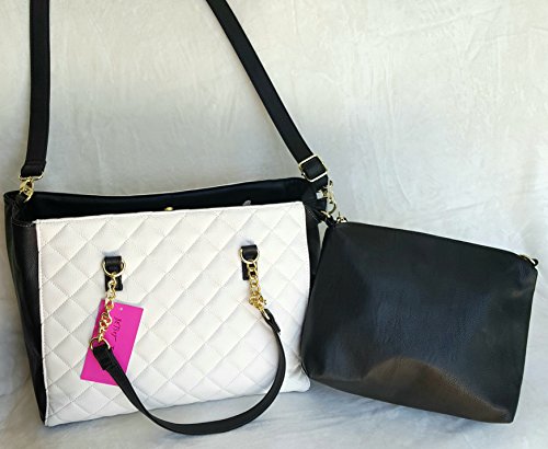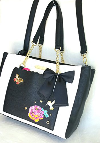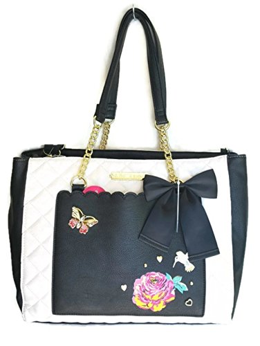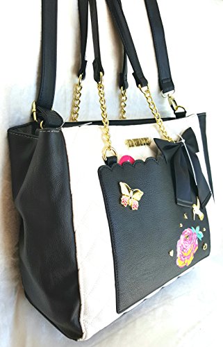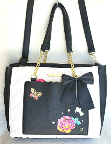 A bag with a Removable Black PU Pouch Bag has an overall Cream (Quilted) & Black PU leather Body & Trim. Front Accented with a Black PU Slip pocket having a Printed Flower, a Humming Bird, a Black Bow, a Goldtone Butterfly decorated w/Rhinestone has Betsey Signature. Top Front has a Gold tone Betsey Signature Name plate. Dual Short Chain+Leather Strap has approx. 10" drop. Longer Black Single Adjustable Strap has approx 24" drop Bag Measures: Length:14" x Height: 11" x Depth: 6.5" approx. Pouch Measures: 11" L x 9"H x 3.25" D