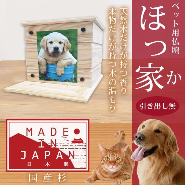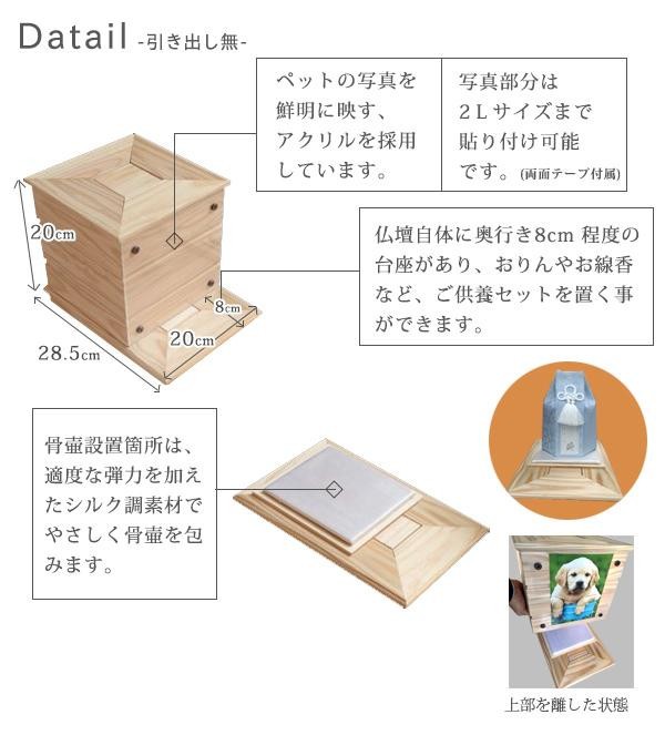 大切なペットを供養するためのペット用仏壇。4寸の骨壺・2寸の骨袋まで収納可能。天然木のぬくもりが大切な家族をあたたかく包み込みます。