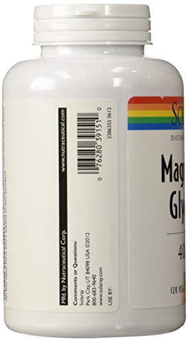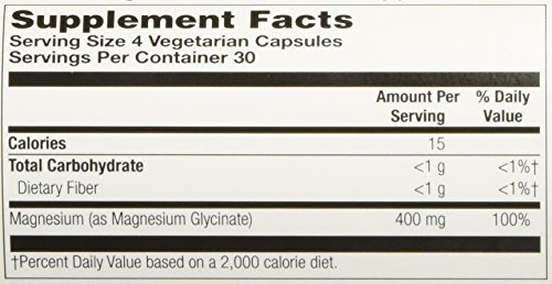 Description:Magnesium Glycinate is believed to offer superior availability of Magnesium to the body. It is intended to provide exceptional nutritive support for normal, healthy, muscle function. Size: 120ct 400mg Directions: Use only as directed. Take four vegetarian capsules daily with a meal or glass of water. Store in a cool, dry place. Serving Size: 4 ea 30 Servings per container Ingredients:Amount per serving:% Daily Value: + Calories15Total Carbohydrate