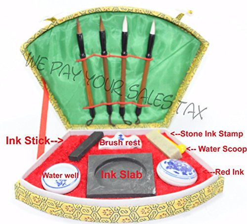 -. Feature : Paper and bottled ink are not included in this set. / Box dimension 8"x6"x1 1/2" / Chinese Calligraphy Set -- 4 Pieces of 5" Brushes, Brush rest , Ink Stone, Ink Slab, Water well, Water scoop , Stone Ink Stamp and a Red Ink you can also use as paper weight. / Add a little water in the slab and use your black ink stone to grind into a real ink. Please grind gently. / A excellent gift for your child or your friends! Enjoying and happy writing!