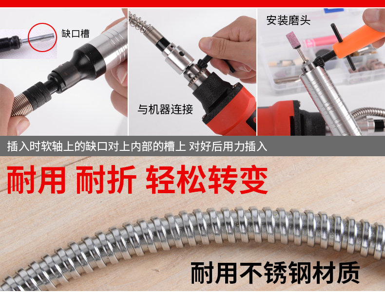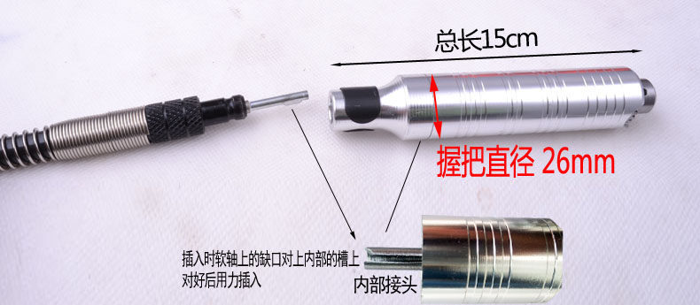 Handle material aluminum alloy aluminum Connecting rod diameter 6mm 6mm Chuck holding range 0.3-4mm 0.6-6mm For the maximum speed of 10000 rev / min 10000 rev / min Grip diameter 26mm 26mm maximum diameter (28mm) Flexible shaft length 110cm 110cm Recommended for use chuck chuck, for fine carving, especially suitable for jade processing (jade processing to add water, the general fear of water mill, but the shaft is not afraid of water)
