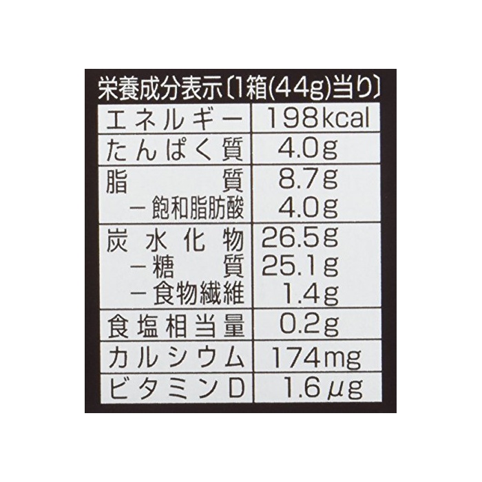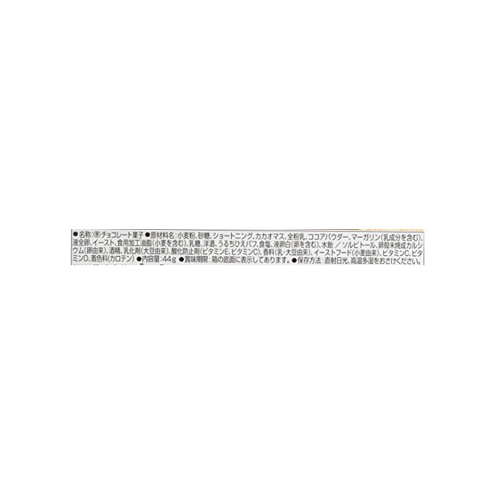 원재료:소맥분,설탕,쇼트닝,카카오 마스,전분유,코코아 파우더,마가린(유성분을 포함한다)고, 액전알,이스트,식용 가공 유지(밀을 포함한다)고, 유당,양주,멥쌀 # 네 퍼프,식염,액계란 흰자(알을 포함한다)고, 수 엿,솔《비토루》,난각미소 성칼슘(난유래)고, 주정,유화 제(대두 유래)고, 산화 방지제(비타민E,비타민C)고, 향료(유대두 유래)고, 이스트 후드(밀 유래)고, 비타민D,비타민C,착색료(카로텐)