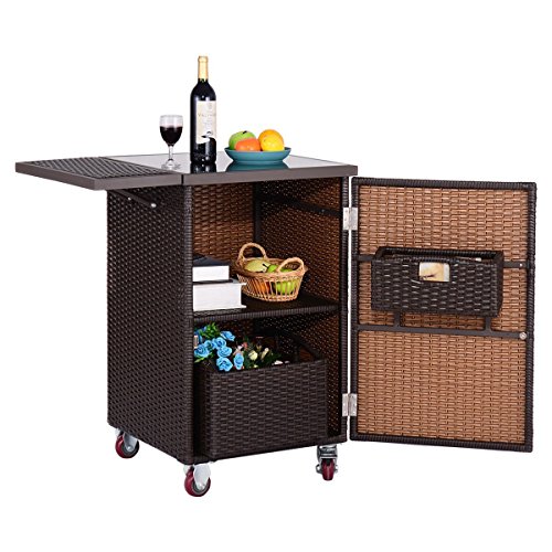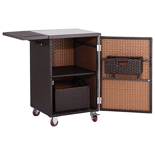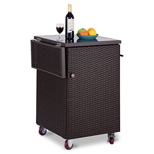 Studio : Apontus Publisher : Apontus Product Description This brown rattan kitchen trolley cart will be great helpful for your outdoor party, and a practical and fashionable furniture to decor your house and your yard! The kitchen cart is made of lightweight rattan and steel frame which is durable and sturdy. It has a hanging basket inside and a large basket with handles for storing some necessary items, such as beverages and other bottles, foods, etc. The left side can be extended as a chopping board. Equipped with 4 smooth rolling wheels, you can move it to anywhere you want. With a glass top, you can put your cup or your bottle on it. And it's also easy to clean with a damp cloth. It's a practical well-designed kitchen cart. 0