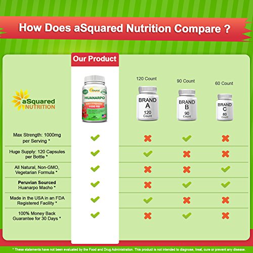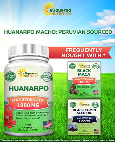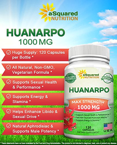MAX STRENGTH HUANARPO: aSquared Nutrition's maximum strength Huanarpo supplement contains 1000mg of Peruvian sourced Huanarpo Macho per serving, and 120 capsules in each bottle for a full 60 day supply. Huanarpo (Jatropha Macrantha) is a shrubby tree species indigenous to Peru that is often used as a sexual enhancement herbal treatment. Don't settle for other tablets or pills that only offer 500mg of Huanarpo per dose, or that only give you 60 or 100 capsules per bottle. *