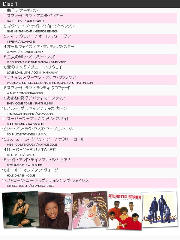 1. スウィート・ラヴ / アニタ・ベイカー SWEET LOVE / ANITA BAKER 2. ギヴ・ミー・ザ・ナイト / ジョージ・ベンソン GIVE ME THE NIGHT / GEORGE BENSON 3. アイ・スウェアー / オール・フォー・ワン I SWEAR / ALL-4-ONE 4. オールウェイズ / アトランティック・スター ALWAYS / ATLANTIC STARR 5. 二人の絆 / シンプリー・レッド IF YOU DON'T KNOW ME BY NOW / SIMPLY RED 6. 愛のすべて / ダニー・ハサウェイ LOVE, LOVE, LOVE / DONNY HATHAWAY 7. ナチュラル・ウーマン / アレサ・フランクリン (YOU MAKE ME FEEL LIKE) A NATURAL WOMAN / ARETHA FRANKLIN 8. スウィート・ラヴ / ランディ・クロフォード ALMAZ / RANDY CRAWFORD 9. あまねく愛で / パティ・オースティン BABY, COME TO ME / PATTI AUSTIN 10. スルー・ザ・ファイア / チャカ・カーン THOROUGH THE FIRE / CHAKA KHAN 11. スーパーウーマン / キャリン・ホワイト SUPERWOMAN / KARYN WHITE 12. ソー・イン・ラヴ・ウィズ・ユー / U.N.V. SO IN LOVE WITH YOU / U. N. V. 13. ミス・ユー・ライク・クレイジー / ナタリー・コール MISS YOU LIKE CRAZY / NATALIE COLE 14. I L-O-V-E U / TAKE6 I L-O-V-E U / TAKE 6 15. ナイト・アンド・デイ / アル・B・シュア! NITE AND DAY / AL B. SURE! 16. ホールド・オン / アン・ヴォーグ HOLD ON / EN VOGUE 17. ストローク・ユー・アップ / チェンジング・フェイシス STROKE YOU UP / CHANGING FACES