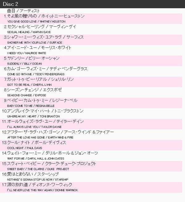1. そよ風の贈りもの / ホイットニー・ヒューストン YOU GIVE GOOD LOVE / WHITNEY HOUSTON 2. セクシャル・ヒーリング / マーヴィン・ゲイ SEXUAL HEALING / MARVIN GAYE 3. シャワー・ミー・ウィズ・ユア・ラヴ / サーフィス SHOWER ME WITH YOUR LOVE / SURFACE 4. アイ・ニード・ユー / モーリス・ホワイト I NEED YOU / MAURICE WHITE 5. サドンリー / ビリー・オーシャン SUDDENLY / BILLY OCEAN 6. カム・ゴー・ウィズ・ミー / テディ・ペンダーグラス COME GO WITH ME / TEDDY PENDERGRASS 7. ガット・トゥ・ビー・リアル / シェリル・リン GOT TO BE REAL / CHERYL LYNN 8. シーズン・チェンジ / エクスポゼ SEASONS CHANGE / EXPOSE 9. ベイビー・カム・トゥ・ミー / レジーナ・ベル BABY COME TO ME / REGINA BELLE 10. アンブレイク・マイ・ハート / トニ・ブラクストン UN-BREAK MY HEART / TONI BRAXTON 11. オールウェイズ・ラヴ・ユー / テイラー・デイン I’LL ALWAYS LOVE YOU / TAYLOR DAYNE 12. アフター・ザ・ラヴ・ハズ・ゴーン / アース・ウインド & ファイアー AFTER THE LOVE HAS GONE / EARTH WIND & FIRE 13. クール・ナイト / ポール・デイヴィス COOL NIGHT / PAUL DAVIS 14. ウェイト・フォー・ミー / ダリル・ホール & ジョン・オーツ WAIT FOR ME / DARYL HALL & JOHN OATES 15. スウィート・ベイビー / クラーク・デューク・プロジェクト SWEET BABY / THE CLARKE / DUKE PROJECT 16. 愛はとまらない / スターシップ NOTHING’S GONNA STOP US NOW / STARSHIP 17. 涙の別れ道 / ディオンヌ・ワーウィック I’LL NEVER LOVE THIS WAY AGAIN / DIONNE WARWICK