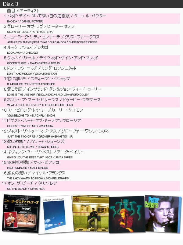 1. バッド・デイ~ついてない日の応援歌 / ダニエル・パウター BAD DAY / DANIEL POWTER 2. グローリー・オブ・ラヴ / ピーター・セテラ GLORY OF LOVE / PETER CETERA 3. ニューヨーク・シティ・セレナーデ / クリストファー・クロス ARTHUER'S THEME(BEST THAT YOU CAN DO) / CHRISTOPHER CROSS 4. ルック・アウェイ / シカゴ LOOK AWAY / CHICAGO 5. グッバイ・ガール / デイヴィッド・ゲイツ・アンド・ブレッド GOODBYE GIRL / DAVID GATES & BREAD 6.愛してほしい/シック I Want Your Love / Chic 7. 君に想いを / スティーヴン・ビショップ IT MIGHT BE YOU / STEPHEN BISHOP 8. 愛こそ証 / イングランド・ダン&ジョン・フォード・コーリー LOVE IS THE ANSWER / ENGLAND DAN AND JOHN FORD COLEY 9. ホワット・ア・フール・ビリーヴス / ドゥービー・ブラザーズ WHAT A FOOL BELIEVES / THE DOOBIE BROTHERS 10. ユー・ビロング・トゥ・ミー / カ-リ-・サイモン YOU BELONG TO ME / CARLY SIMON 11. ビゲスト・パート・オブ・ミー / アンブロ-ジア BIGGEST PART OF ME / AMBROSIA 12. ジャスト・ザ・トゥー・オブ・アス / グローヴァー・ワシントンJR. JUST THE TWO OF US / GROVER WASHINGTON, JR. 13. 悲しき願い / ハワード・ジョーンズ NO ONE IS TO BLAME / HOWARD JONES 14. ギヴィング・ユー・ザ・ベスト / アニタ・ベイカー GIVING YOU THE BEST THAT I GOT / ANITA BAKER 15. 30秒の奇跡 / マット・ビアンコ HALF A MINUTE / MATT BIANCO 16. 淑女の想い / マイケル・フランクス THE LADY WANTS TO KNOW / MICHAEL FRANKS 17. オン・ザ・ビーチ / クリス・レア ON THE BEACH / CHRIS REA