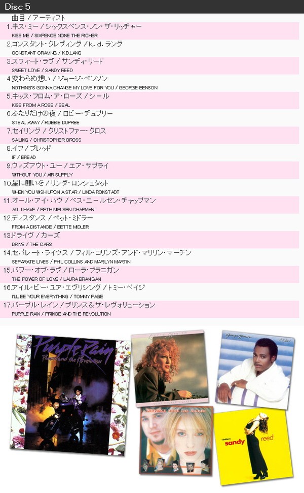 1. キス・ミー / シックスペンス・ノン・ザ・リッチャー KISS ME / SIXPENCE NONE THE RICHER 2. コンスタント・クレヴィング / k.d.ラング CONSTANT CRAVING / K.D.LANG 3. スウィート・ラヴ / サンディ・リード SWEET LOVE / SANDY REED 4. 変わらぬ想い / ジョージ・ベンソン NOTHING'S GONNA CHANGE MY LOVE FOR YOU / GEORGE BENSON 5. キッス・フロム・ア・ローズ / シ-ル KISS FROM A ROSE / SEAL 6. ふたりだけの夜 / ロビー・デュプリー STEAL AWAY / ROBBIE DUPREE 7. セイリング / クリストファー・クロス SAILING / CHRISTOPHER CROSS 8. イフ / ブレッド IF / BREAD 9. ウィズアウト・ユー / エア・サプライ WITHOUT YOU / AIR SUPPLY 10.フィラデルフィアより愛をこめて / スピナーズ COULD IT BE I'M FALLING IN LOVE / SPINNERS 11. オール・アイ・ハヴ / ベス・ニ-ルセン・チャップマン ALL I HAVE / BETH NIELSEN CHAPMAN 12. ディスタンス / ベット・ミドラー FROM A DISTANCE / BETTE MIDLER 13. ドライヴ / カーズ DRIVE / THE CARS 14. セパレート・ライヴス / フィル・コリンズ・アンド・マリリン・マーチン SEPARATE LIVES / PHIL COLLINS AND MARILYN MARTIN 15. パワー・オブ・ラヴ / ローラ・ブラニガン THE POWER OF LOVE / LAURA BRANIGAN 16. アイル・ビー・ユア・エヴリシング / トミー・ペイジ I'LL BE YOUR EVERYTHING / TOMMY PAGE 17. パープル・レイン / プリンス&ザ・レヴォリューション PURPLE RAIN / PRINCE AND THE REVOLUTION