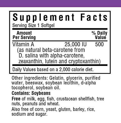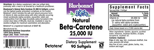 Bluebonnet's Mixed Carotene Beta-Carotene 25,000 IU Soft gels offer one the highest quality antioxidant complexes on the market, Betatene, which includes the safe and natural precursor form of vitamin A, beta-carotene along with other naturally occurring mixed carotenoids (alpha-carotene, zeaxanthin, lutein and cryptoxanthin) from the algae Dunaliella salina harvested in the crystal clean lakes of Whyalla, Australia. Beta Carotene is converted to Vitamin A, an essential nutrient. It has antioxidant activity, which helps to protect cells from damage.Feature