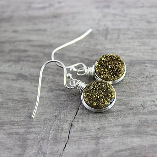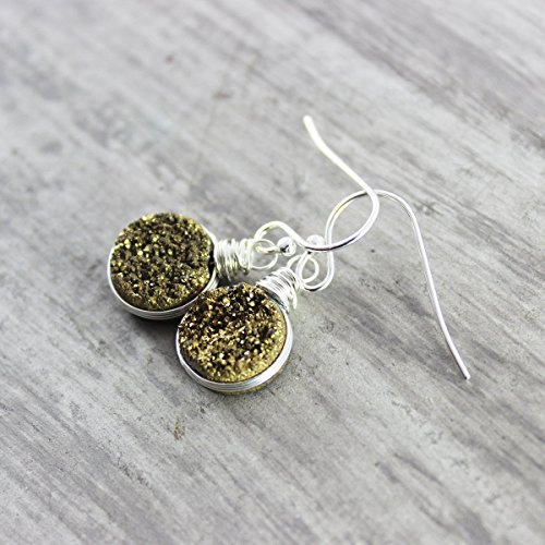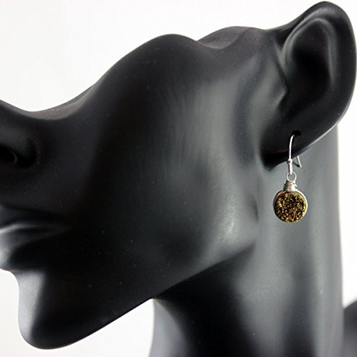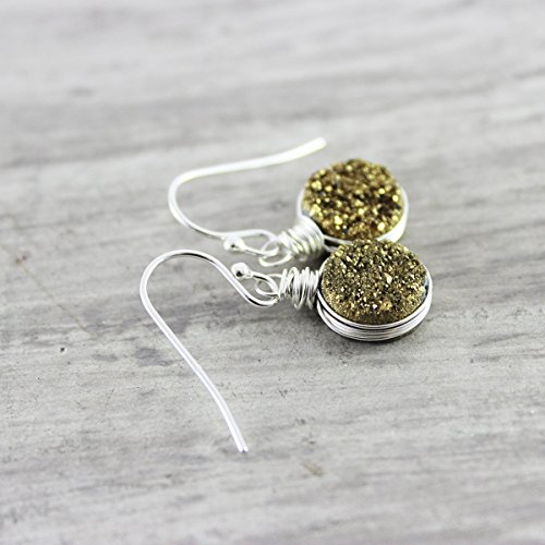 These earrings feature beautiful 10mm dark gold druzy quartz circle stones that have been wire wrapped in sterling silver wire. They hang from sterling ear wires. Note: Each bead will be slightly different, as with all druzy quartz, and no two pairs of earrings will be 100% exactly alike, as they are also wrapped by hand. They will be matched as closely as possible.