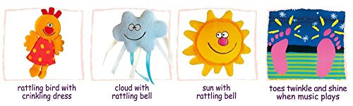 Three hanging soft toys provide plenty for baby to feel and grab, including a rattling bird with a colourful crinkly dress, a cute cloud with a rattling bell and a smiling rattling sunshine, all of which will encourage baby to develop senses and fine motor skills