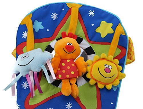 Gentle music plays and soft lights twinkle when baby kicks the soft kick pad. The Baby Safe Mirror surrounded by stars add to the play value and aid the development of Baby's Visual and Aural Senses