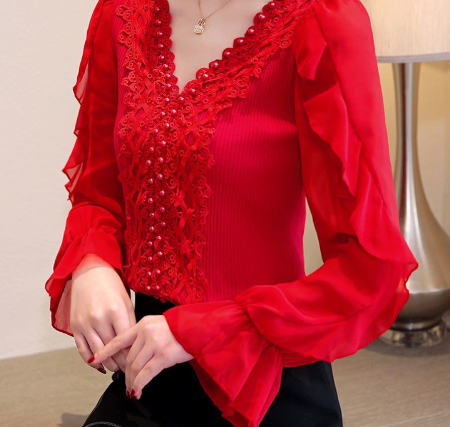 ビーズ入りの刺繍やデコルテが綺麗に見えるVネックが女の子らしさ抜群の1着ですね。