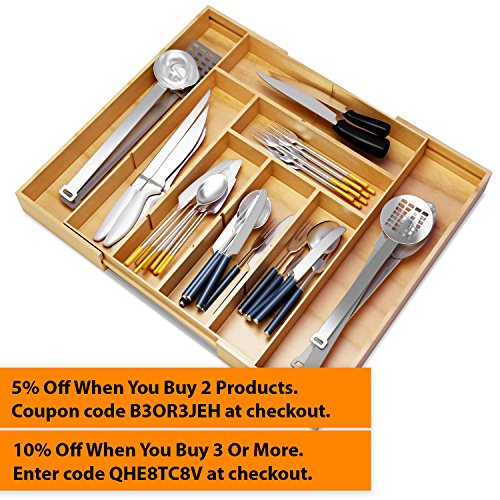 Silverware Kitchen Drawer Organizer -Expendable Bamboo Tray with Adjustable Dividers Eliminate Clutter-Great As a Flatware Utensil Holder,Keurig K Cup Coffee Capsules Storage or Spice Rack