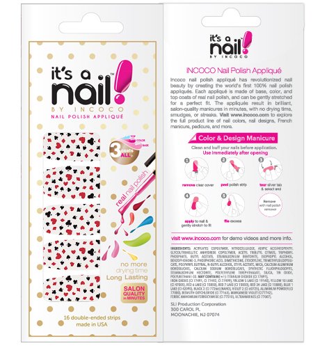 THE PERFECT MANICURE IN MINUTES! Incoco has revolutionized nail beauty by creating the world's first 100% real nail polish appliques! Each applique is made of a base, color and top coat of real nail polish. These appliques are flexible and can be gently stretched to easily fit any nail size and shape. The result is a brilliant, salon-quality manicure in minutes with no dry time, smudges or streaks.Feature