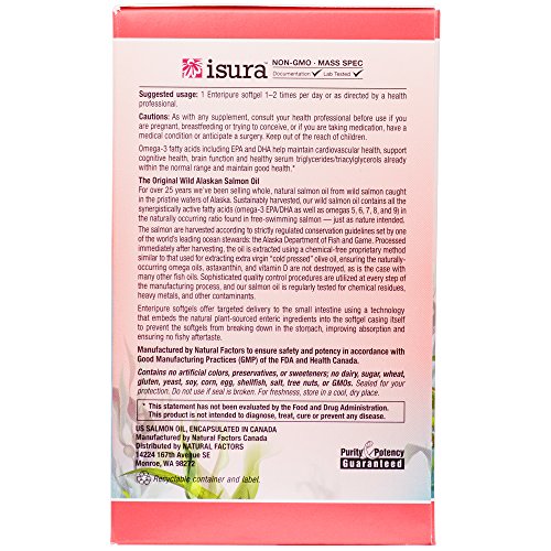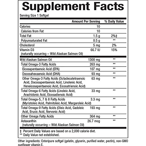 The Original Wild Alaskan Salmon Oil! For over 25 years we've been selling our whole and natural wild salmon oil, sourced from the pristine waters of Alaska. 100% sustainably wild-caught, our salmon oil contains all the synergistically active omega fatty acids in a ratio found in free-swimming salmon, as well as the antioxidant astaxanthin and vitamin D - just as nature intended. Processed immediately after harvest, the oil is made using a chemical-free proprietary extraction method, in a manner very similar to that used for extraction of extra virgin cold pressed olive oil. Our method is temperate so that the naturally occurring omegas, astaxanthin and vitamin D are not destroyed as is the case with many other fish oils. Sophisticated quality control procedures are utilized in every step of our manufacturing process and our facility is strictly enforced by Alaska Department of Fish & Game. Our salmon oil is regularly tested for chemical residue and heavy metals to ensure a safe and pure source of fish oil, free of heavy metals and other contaminants. Complete Omega 100% Wild Alaskan Salmon Oil Enteripure soft gels offer targeted delivery using a technology that embeds pure and natural ingredients into the soft gel casing to prevent them from breaking down in the stomach, ensuring no fishy aftertaste. Omega-3 fatty acids including EPA and DHA help to maintain cardiovascular health, support cognitive health and brain function, reduce serum triglycerides/triacylglycerols and maintain good health.Feature