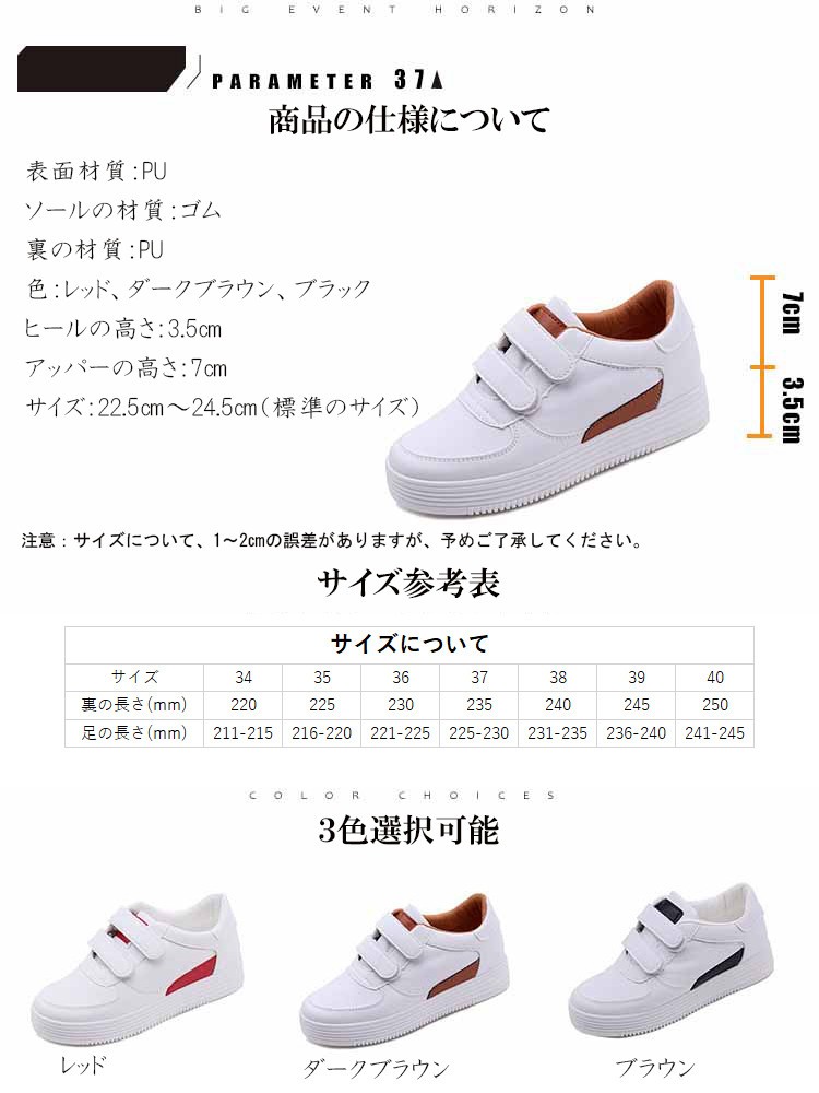 表面材質:PUソールの材質:ゴム裏の材質:PU ヒールの高さ:3.5cm アッパーの高さ:7cmサイズ:22.5cm~24.5cm(標準のサイズ)EU36=22.5cm EU36=23cm EU37=23.5cm EU38=24cm EU39=24.5cm EU40=25cm 注意:※ サイズなど、商品詳細を必ずご確認後、ご了承頂いた上でご購入をお願いします。また、採寸方法違いにより、0.5~1cmの誤差がございますので、ご了承ください。特徴:【軽量、通気性よい】ゴムのソールとキャンパスの材質でスポーツシューズならではの軽さを実現し、通気性もよいです。どんな季節でも着用します。 軽量なので、ランニングや歩くや他の運動が易くになりました。【ファッションな配色】ファッションな配色で、シューズがファッションになり、女性に最適です。中学生などに通学靴としてもよい選択です。 【ゴムのソール耐滑】柔らかい材質で作って、ゴムのソールので、耐滑のです。スムーズな足運びをサポートします。球技や他の運動にもスムーズになりました。【利用場合】スポーツだけでなく、通勤や通学やアウトドア、普段履きとしても カジュアルなコーディネートをお楽しみい ただけます。