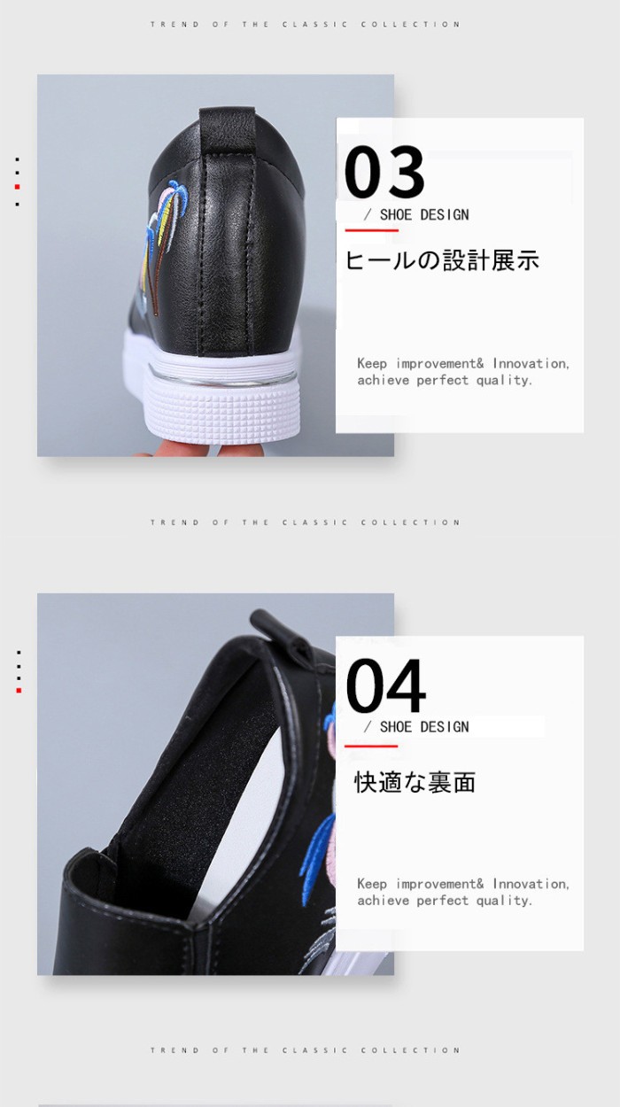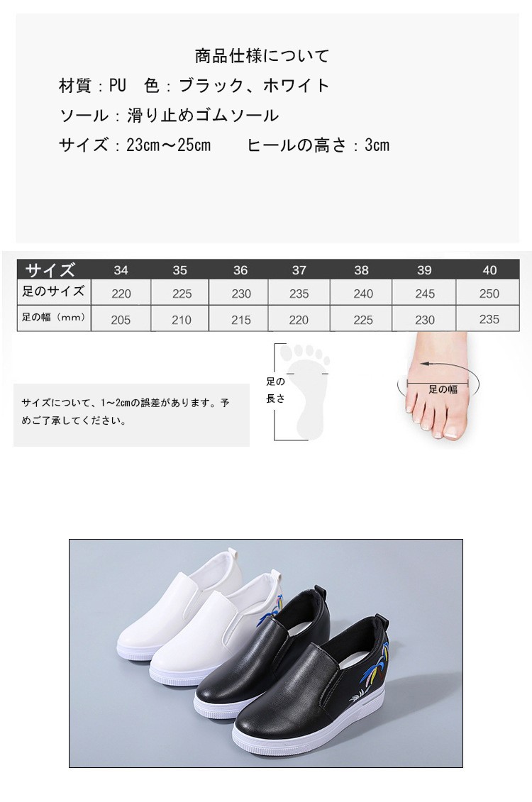 材質:PU+ゴム色:ブラック、ホワイトサイズについてヒールの高さ:3cmEU36=23cm EU37=23.5cm EU38=24cm EU39=24.5cm EU40=25cm注意:※ サイズなど、商品詳細を必ずご確認後、ご了承頂いた上でご購入をお願いします。また、採寸方法違いにより、0.5~1cmの誤差がございますので、ご了承ください。商品内容:1xスニーカー特徴:【軽量、通気性よい】ゴムのソールPUの材質でスポーツシューズならではの軽さを実現し、通気性もよいです。どんな季節でも着用します。 軽量なので、ランニングや歩くや他の運動が易くになりました。【インヒール】ファッションなインヒールのデザインは女性の足はもっと長くに見られます。どの服にもピッタリです。【ゴムのソール耐滑】柔らかい材質で作って、ゴムのソールので、耐滑のです。スムーズな足運びをサポートします。【利用場合】スポーツだけでなく、通勤や通学やアウトドア、普段履きとしても カジュアルなコーディネートをお楽しみい ただけます。