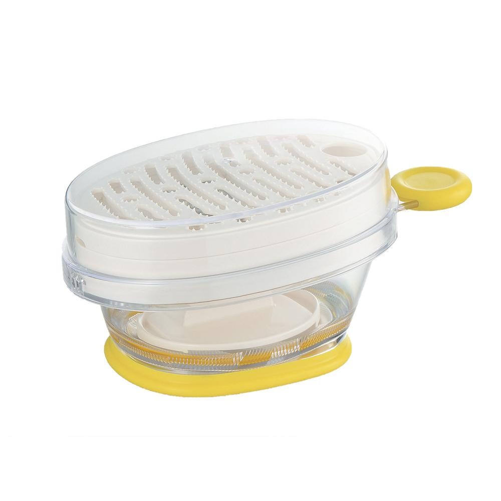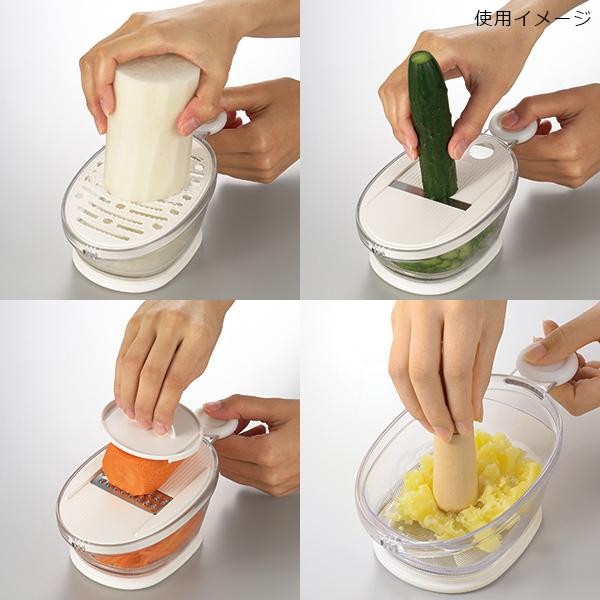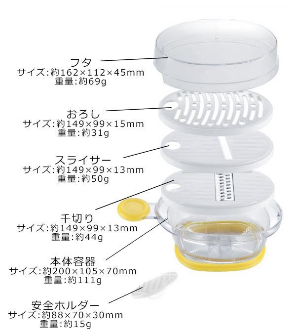 | 素材・材質 | 本体容器:AS樹脂 蓋:スチロール樹脂 スライサー・千切り:ABS樹脂(刃:ステンレス) おろし・ホルダー:ABS樹脂 本体底すべり止め・本体グリップ:熱可塑性エラストマー |