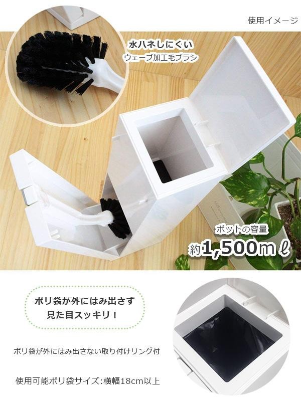 | シンプル設計でスタイリッシュなデザインのトイレブラシケースです。ゴミ箱とブラシケースが一体型に!洋式便器に腰掛けたままでポットが使いやすい高さ!付属の専用ブラシを隠して収納できるので、トイレブラシとしてのイメージを感じさせません。 |