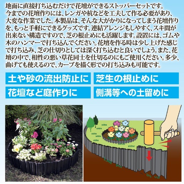 地面に直接打ち込むだけで花壇ができるストッパーセットです。今までの花壇作りには、レンガや杭などを工夫して作る必要があり、大変な作業でした。本製品は、そんな大がかりになってしまう花壇作りを、もっと手軽にできるグッズです。連結アレンジもしやすく、スキ間が出来ない構造ですので、芝の根止めにも活躍します。設置には、ゴムや木のハンマーで打ち込んでください。花壇を作る時は少し上げた感じで打ち込み、芝の仕切りとしては深く打ち込むと良いでしょう。また、花壇の中で、相性の悪い草花同士を仕切るのにもご使用ください。多少、曲げても使えるので、カーブを描く形での打ち込みも可能です。20枚使用で最大約2.8mの連結が可能。