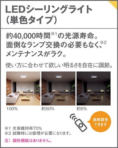 【Checkpoint before purchasing lighting fixtures】 [Description of icons] ◆ Design classification: casual ◆ LED built-in · Power supply unit built-in ◆ Soft turn method ◆ LED exchange not possible ◆ Light source life 40,000 hours (light flux maintenance rate 70%) ◆ Remote control
