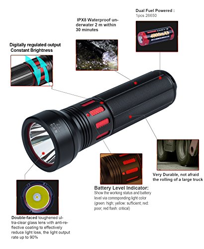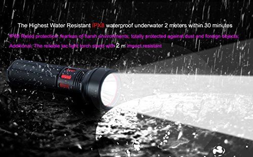 - The highest waterproof flashlight IPX8 submersible 2 meter, 5.59 inch length, 1.33 inch diameter, 1.73 inch head diameter. The Pocket-size flashlight are easy to use and carry. Unique luminous button make you no worry about to find the camping flashlight even in dark; Neck indicator to know the status of your high beam flashlights