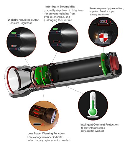 - Low-voltage warning function to remind users of low power; Digitally-regulated output (maintains constant brightness); Reverse polarity protection to protect from improper battery installation; over-charging, over heating protective circuit protect you using super bright flashlight safety, and we support 45 days free replacement, 2 years free repairs