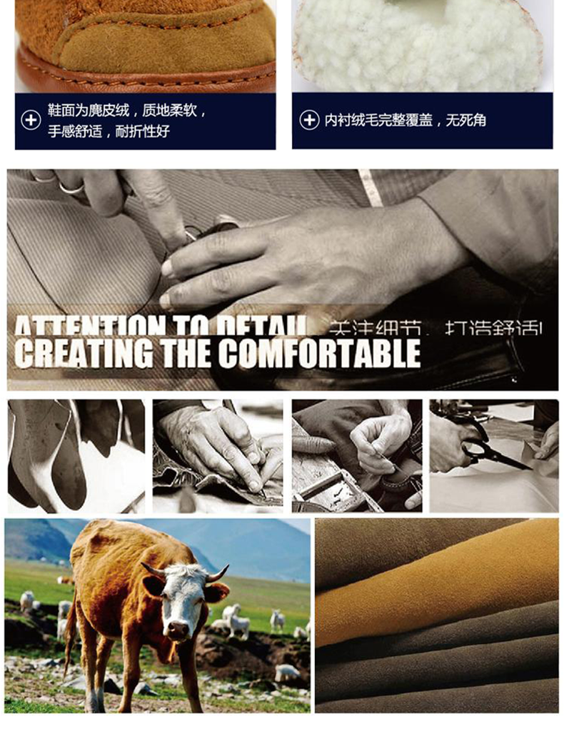 Material: suede uppers and velvet lined slip sole warm fashion