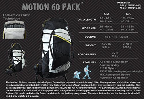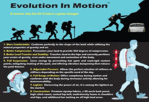 -. Feature : Airframe with Adjustable Air Pressure: Curves to your back for ergonomic comfort, allows airflow for enhanced ventilation, provides structure to help manage load transfer, and absorbs shock / Water Resistant: The lightweight, durable nylon fabric is treated to resist water and shed light snow / Storage Space: 60-liter capacity carries the gear for multiday adventures / Lightweight Frame Technology: Leveraging the lightness of air, the inflatable Airframe eliminates the need for metal stays and plastic sheets making it lighter than traditional frame systems / Integrated Hand Pump: Intelligently placed where it can be reached and utilized while wearing the pack, the integrated hand pump and release valve let you fine-tune the Airframe's pressure