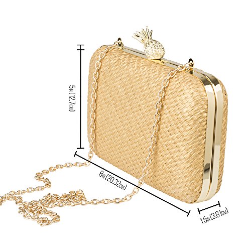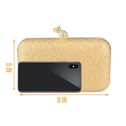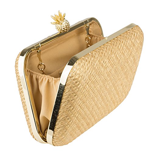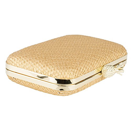 - DAZZLING DETAILS: This gorgeous Gold Raffia Pineapple Minaudiere features brushed gold hardware, secure lift clasp closure, polyester shell and cotton lining.