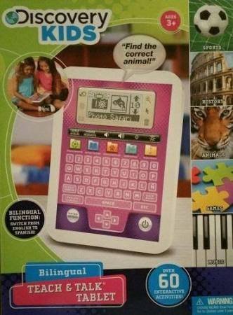 This Discovery Kids Teach & Talk Activity Tablet includes more than 60 entertaining activities for kids! Bilingual Teach & Talk Tablet features LCD display, full-function keyboard, digital speech technology, and built in categories to make learning easy and fun. Play in English or Spanish language. It is sure to provide hours of learning fun!Feature