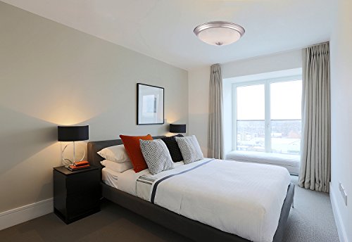 Envirolite low profile ceiling light fixtures are designed to enhance any decor and with a clean, fresh appearance. This modern LED ceiling light fixture easily mounts flush with the ceiling, and the low profile design keeps it out of the way of closet doors. The protective brushed nickel finish will look great for years to come, and the frosted white lens diffuses the LED light evenly. You won't see any Dark spots or shadows. This ceiling light features a center lock design. This flush mount uses a LED powered lighting engine instead of lamps to produce higher quality light for a fraction of the electricity, saving you money off your utility bill. This light fixture produces 800 lumens (about the equivalent of a 75-Watt light bulb) using only 12.5-Watt. The LED lighting source is made to last for 50,000 hours or 45 years at 3 hours per day; there are no bulbs to replace -ever. This ceiling fixture is energy star listed and environmentally friendly.Feature