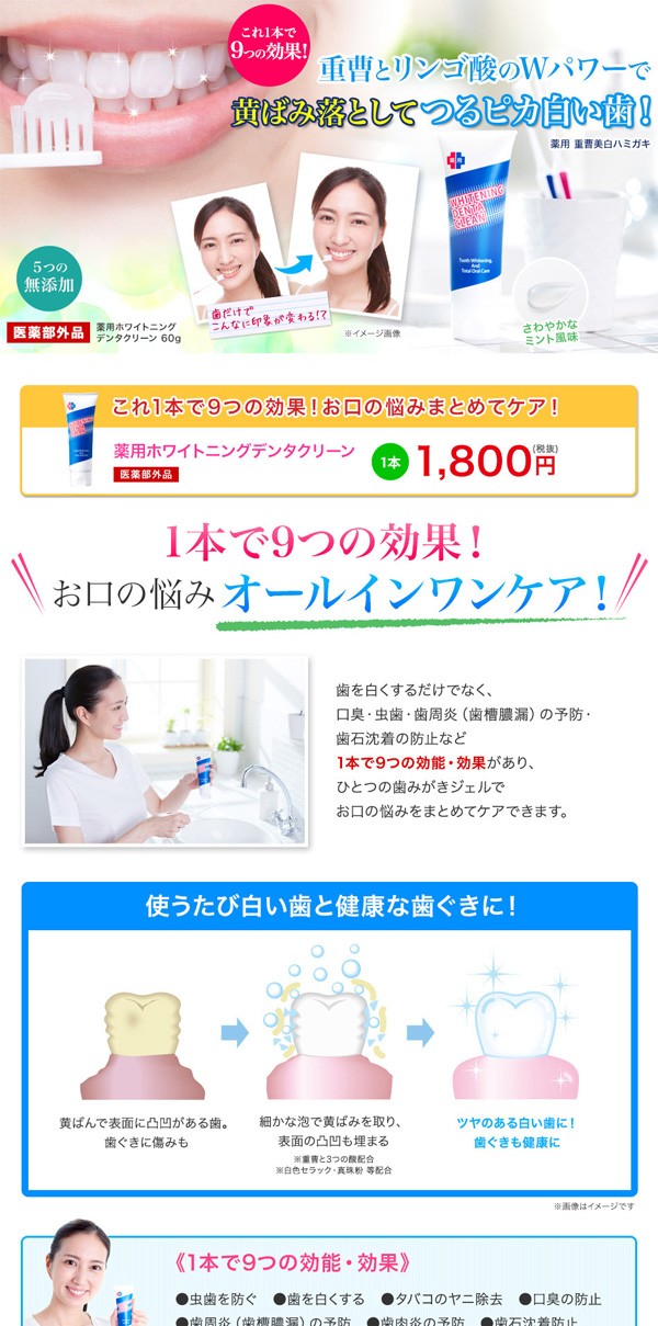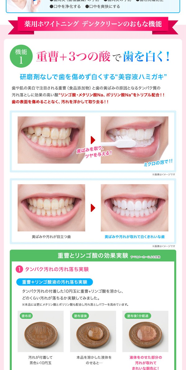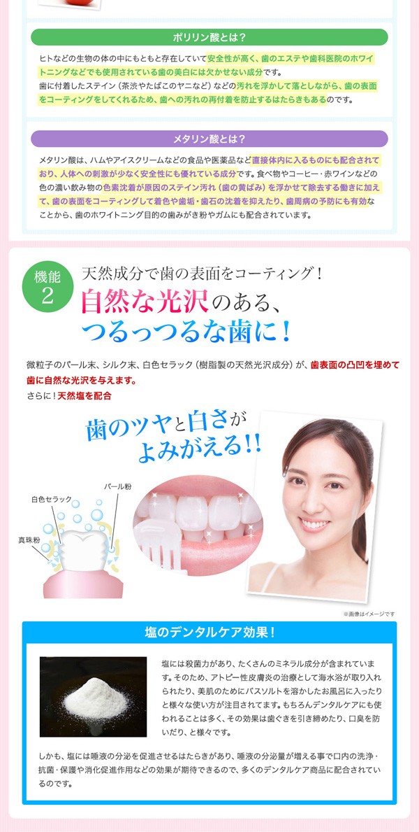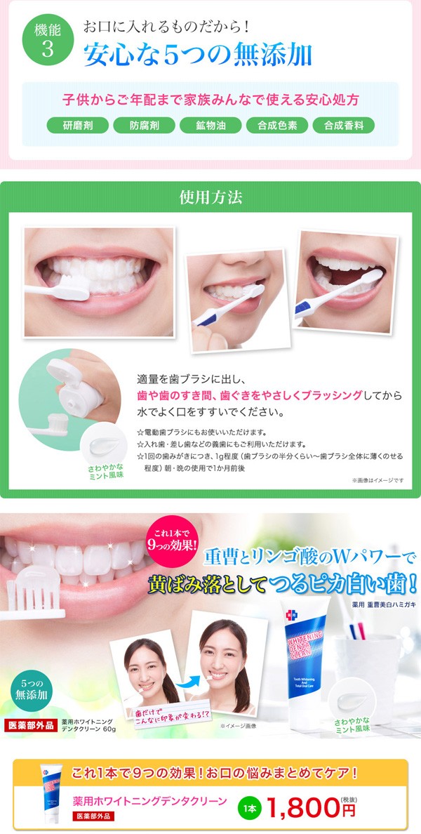 歯を白くする、口臭の防止、タバコのヤニ除去、虫歯を防ぐ、歯周炎(歯槽膿漏)の予防、歯肉炎の予防、歯石沈着防止、口中を浄化する、口中を爽快にする |