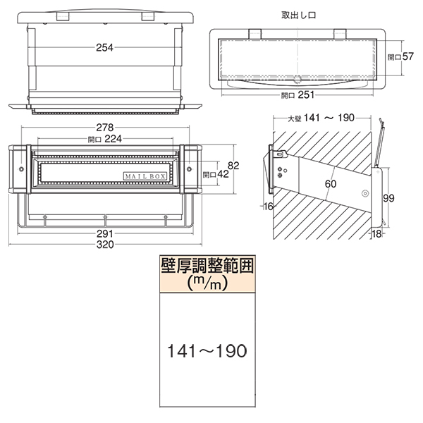 ●スペック:受口部:幅(mm)320 高さ(mm)82 取出し口開口寸法:幅(mm)251 高さ(mm)57 壁厚調整範囲141~190mm