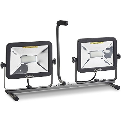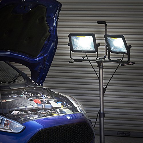 VonHaus 100W LED Worklight with Adjustable Tripod Suitable for both indoor and outdoor use, the VonHaus 100W LED Worklight easily illuminates poorly-lit working environments. Generating an impressive 10000 Lumens, the two 50W LEDs offer a practical alternative to traditional halogen bulbs. This powerful tripod is designed to stand up to the rigors of the most demanding usage. In addition, the LED lights stay cool to the touch, unlike halogen bulbs which give off a considerable amount of heat and are 5 X less energy efficient. Daylight Brightness The bright white light emitted from the dual lamps mimics daylight - easily illuminating poorly-lit areas and improving visibility while you work. The LED lights are bright enough to enable you to clearly see detail and vivid colors - crucial when dealing with tasks involving electrical wiring. Height Adjustable Tripod Constructed from aluminium, the lightweight and durable telescopic tripod is fully height adjustable. The telescopic legs can be extended up to 5.25ft - enabling you to alter the position according to the task in hand. The tripod's quick release mechanism allows the LED lamps to be rapidly detached from the tripod for a faster setup, breakdown and easy storage. Rotatable LED Lamps Both LEDs can be rotated - allowing you to position the light source where you need it most. Suitable for outdoor use, the powerful LEDs are sealed in a die cast waterproof aluminium housing and are protected by impact-resistant glass lenses for added durability. Easy Manoeuvrability The worklight comes with a generous 8.2ft power cord, giving you the freedom to move the tripod around a wider area without having to stay close to a plug socket or keep switching to a different power source. The sealed power switch also means that you can use the worklight safely in damp conditions. Tripod Size: 85.8 X 33.5 X 30.3" inches (fully extended)Feature