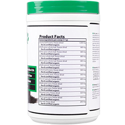 Digestive Greens is a health supplement for dogs & cats formulated to provide high fiber greens and grasses to support digestion and provide antioxidants. Dogs and cats naturally graze on grass or munch on houseplants (many of which are poisonous!). This instinct, in the wild, would be a means to get chlorophyll into their diet, which is incredibly beneficial for their health. However, these days many of our pets don't get access to fresh grass and with the common use of pesticides, it's not ideal for eating. Additionally, lawn grass does not have the same health value and can get caught in the back of a dog or cat's throat, causing gagging. Digestive Greens contains a tremendous assortment of grasses and greens, such as parsley and wheatgrass which provide a wide array of health benefits from aiding digestion and providing energy, to fighting bad breath. In an easy powder form, you can sprinkle the greens on your pet's food at meal time. Digestive Greens are grain-free, raw, certified organic, grown in the U.S.A., and pets love the taste.Feature