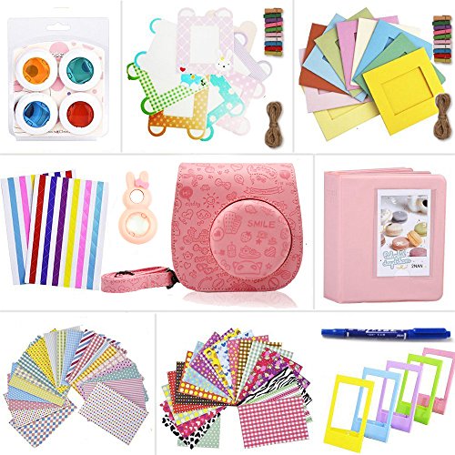 Shaveh Fujifilm Instax Mini 8/8+ Mini 9 Accessories, 11 in 1 Camera Set Include Camera Case/Album/Selfie Lens/Colored Filters/Wall Hang Frames/Film Frames/Border Stickers/Corner Stickers/Pen (Pink)